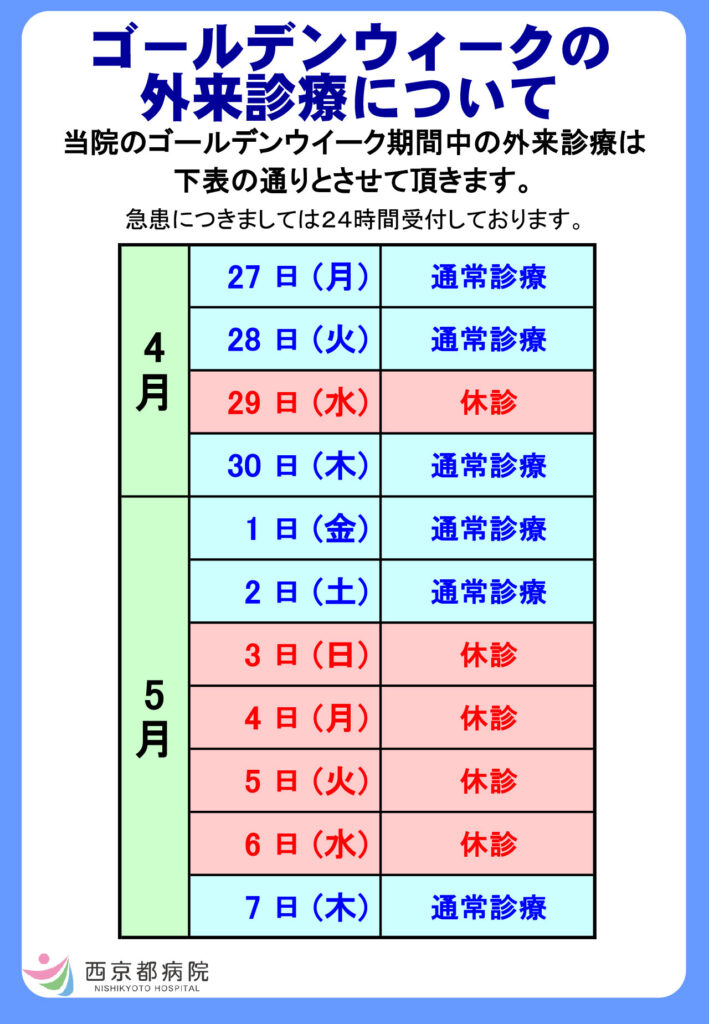ゴールデンウィーク期間中の外来診療は下記のとおりとさせていただきます。