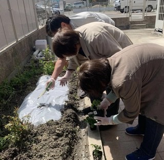 先日、洛桂の郷園芸部の皆さんが、苗植えをされていました。今回植えたのは、イチゴとトマトです。