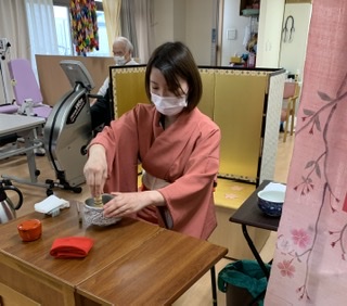 本日、デイサービスで春のお茶会が開催されました。デイスタッフが着物に着替えて、皆さんをおもてなし。