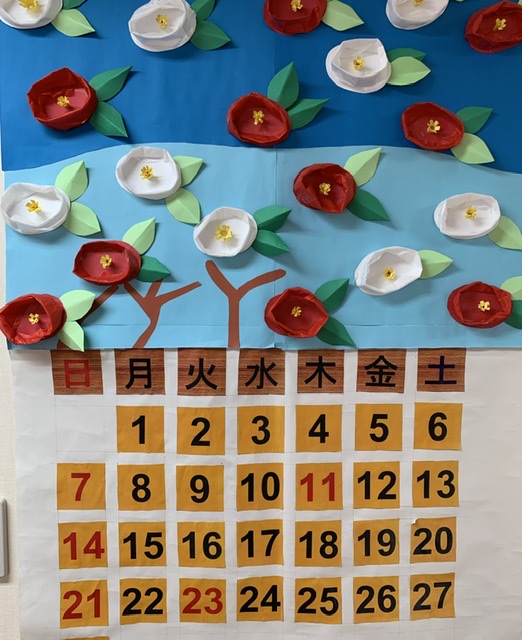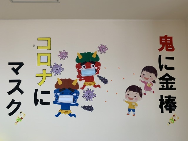 デイサービスフロアの奥の方になりますが、広い壁があり、そこに毎月、壁画をしています。今は来月に向けて、節分の壁画になっています。