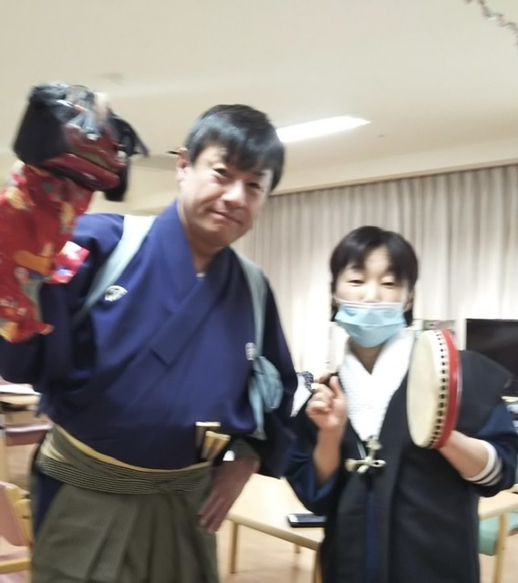 サ高住に、獅子頭が来てくれました。獅子に頭をかまれると、その年は無病息災で元気で過ごせるという言い伝えがあります。