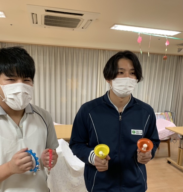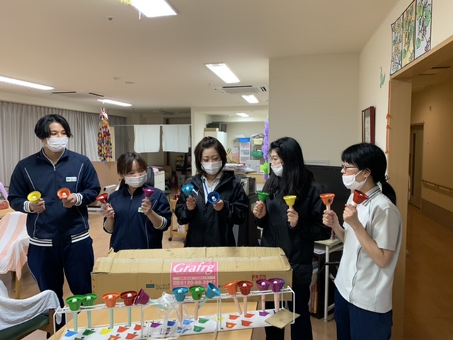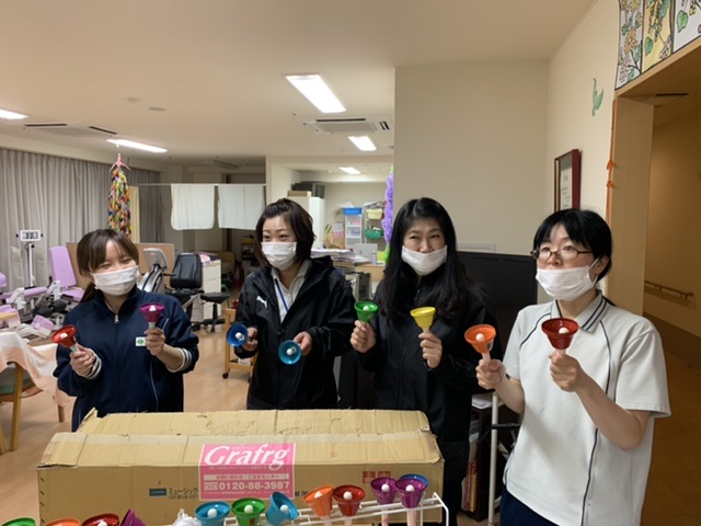 今月のデイサービスのイベントですが、もちろんクリスマスパーティーを予定しています。皆さんに喜んでもらえるよう、スタッフがハンドベルを練習しています。