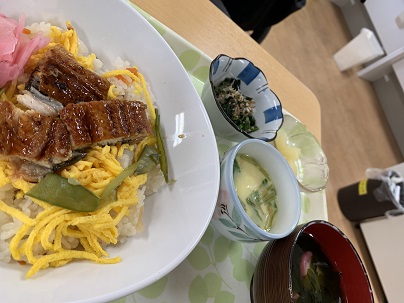 今日のお昼ご飯は、うなぎ丼でした。茶碗蒸しもついていて、とても豪華なメニュー!